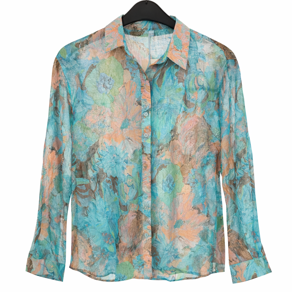 Laat je stijl spreken met de Ocean Bloom Artist Blouse een unieke, kunstzinnige blouse met een verfijnde mix van zachte blauwtinten, aquagroen en warme aardse accenten. De print doet denken aan een schilderachtig bloemenlandschap, waardoor elk exemplaar een echte eyecatcher is.