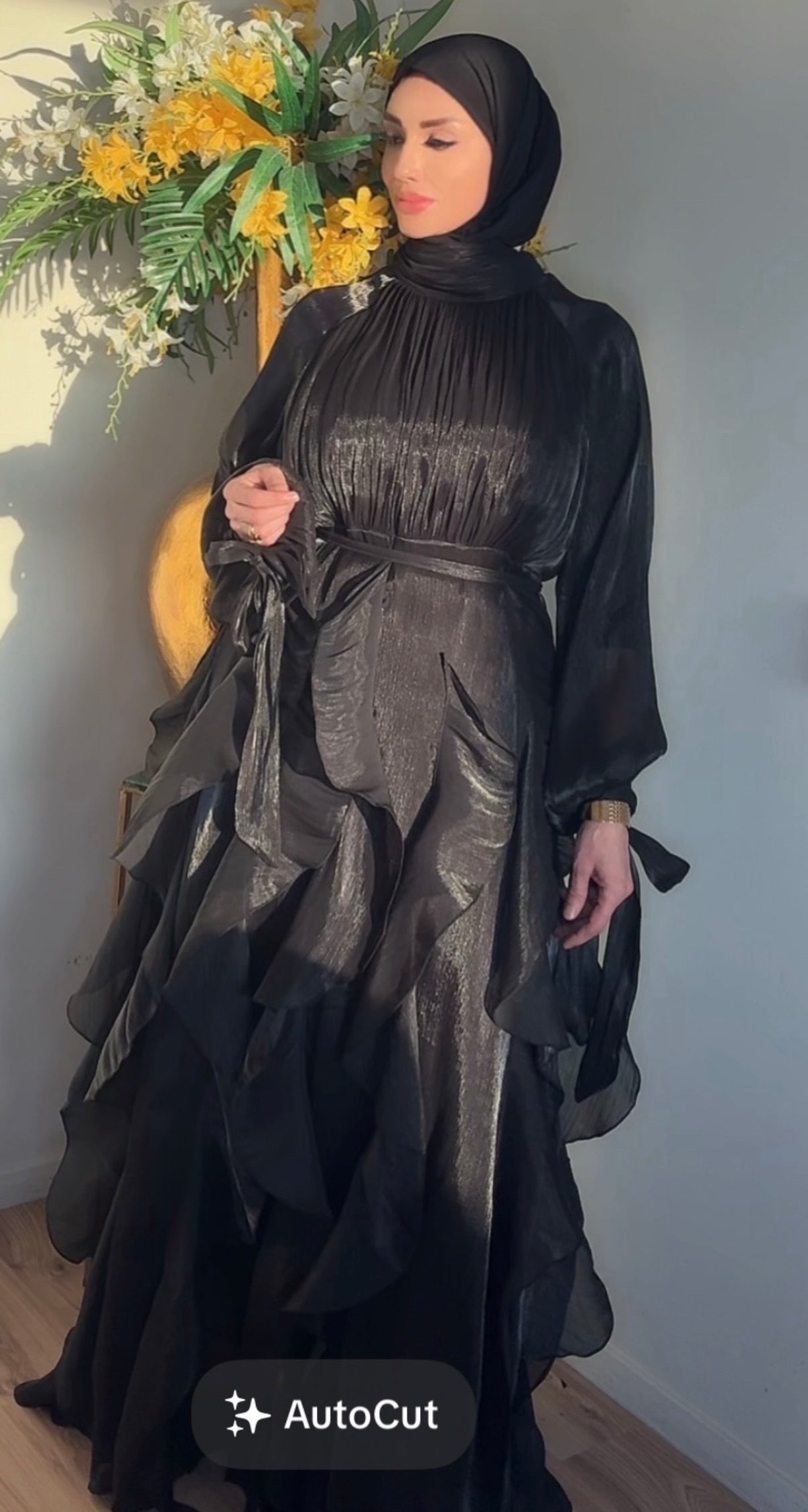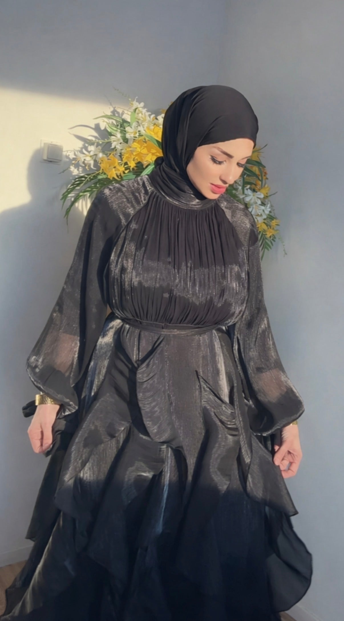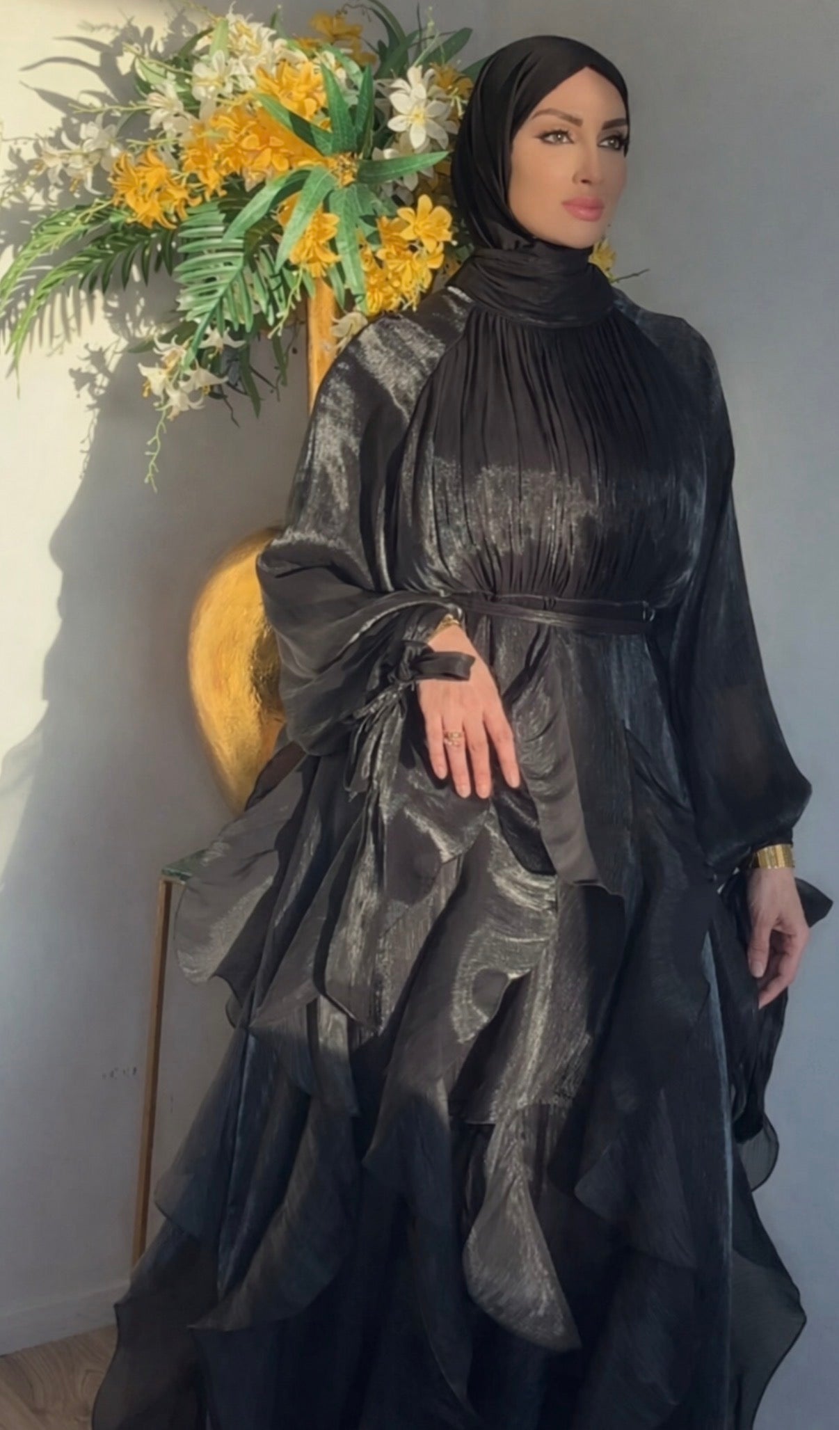 De Flamingo Dress is gemaakt van een soepelvallende, luxe stof met subtiele glans die prachtig meebeweegt bij elke stap. De verfijnde plooien, volumineuze rok en elegante mouwen zorgen voor een chique uitstraling perfect voor speciale gelegenheden, diners en events.