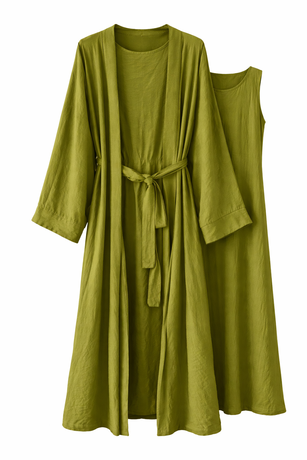 Deze elegante tweedelige abaya set straalt pure klasse en comfort uit. Gemaakt van een luchtige linnen stof, perfect voor zowel dagelijks gebruik als speciale gelegenheden. De set bestaat uit een mouwloze binnenjurk en een stijlvolle open abaya met wijde mouwen en een bijpassende ceintuur die de taille mooi accentueert.